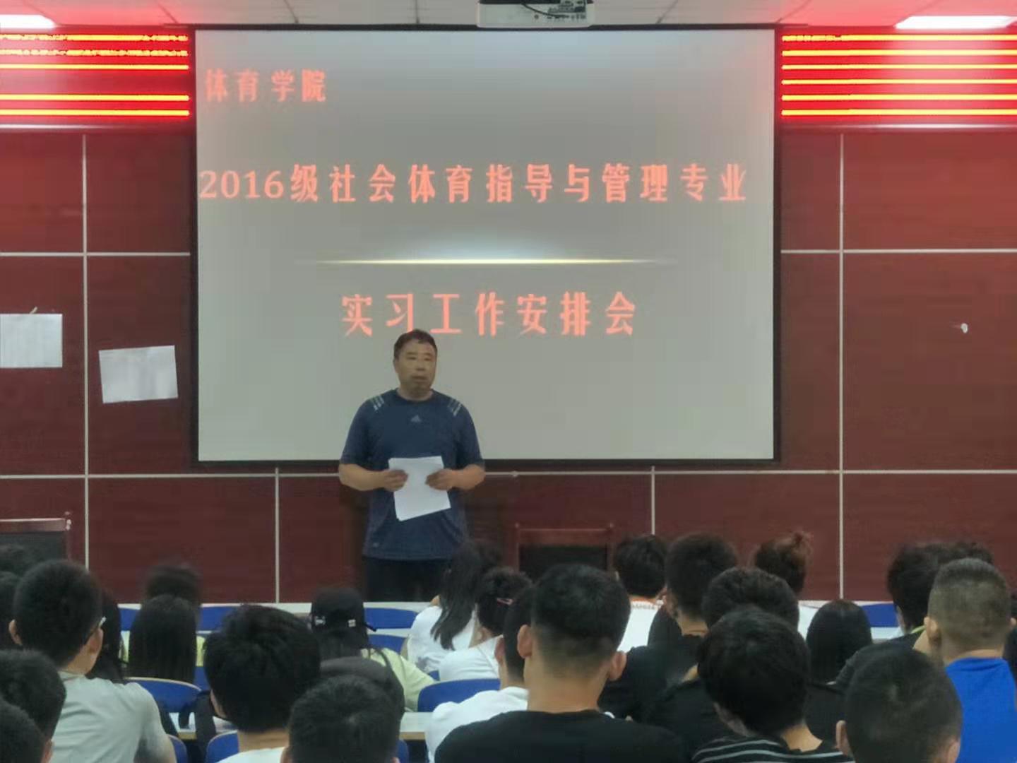 9月2日下午4:30,太阳集团城娱87222016级社会体育指导与管理专业实习工作安排会在体育馆多媒体教室召开,太阳集团城娱8722副院长梁超勋、辅导员柴九昌、教学秘书张娟老师出席了会议,2016级社会体育指导与管理专业93名同学参加了会议。会议由柴九昌主持。
