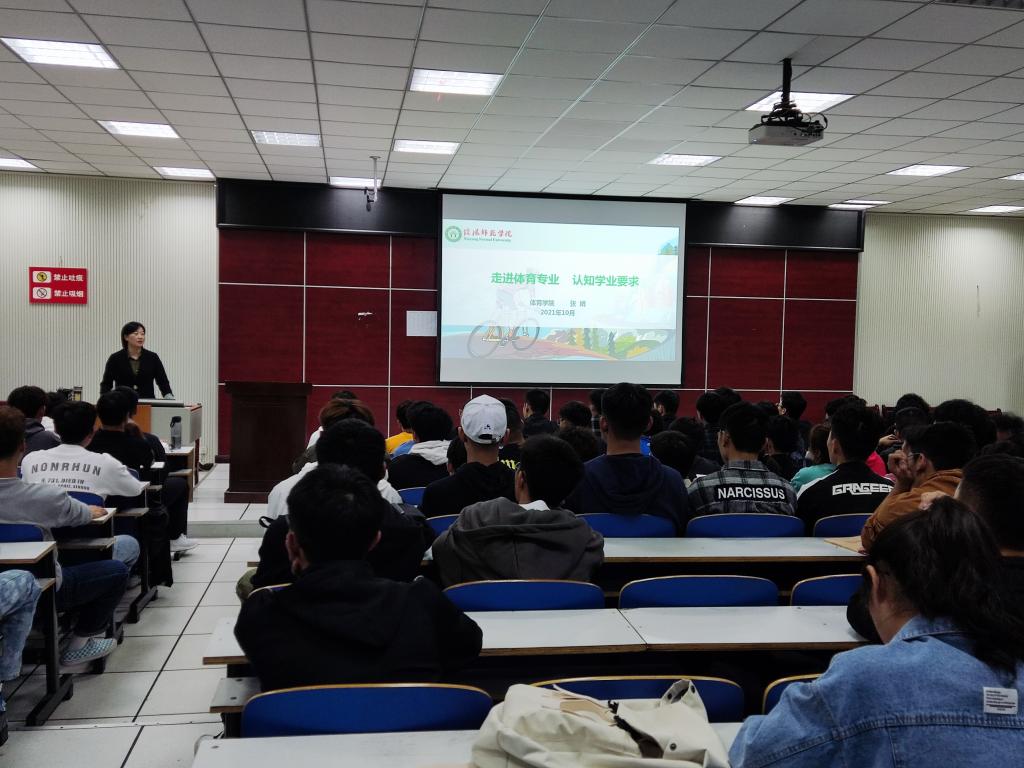 “良好的开端是成功的一半",为了大一新生尽快融入大学的学习生活,我院于10月5日晚7点在体育馆多媒体教室举行了主题为“走进体育专业,认知学业要求”的新生入学教育讲座,本次讲座由我院分管本科教学的副院长张娟主讲,本次活动由我院党委副书记柴九昌主持。