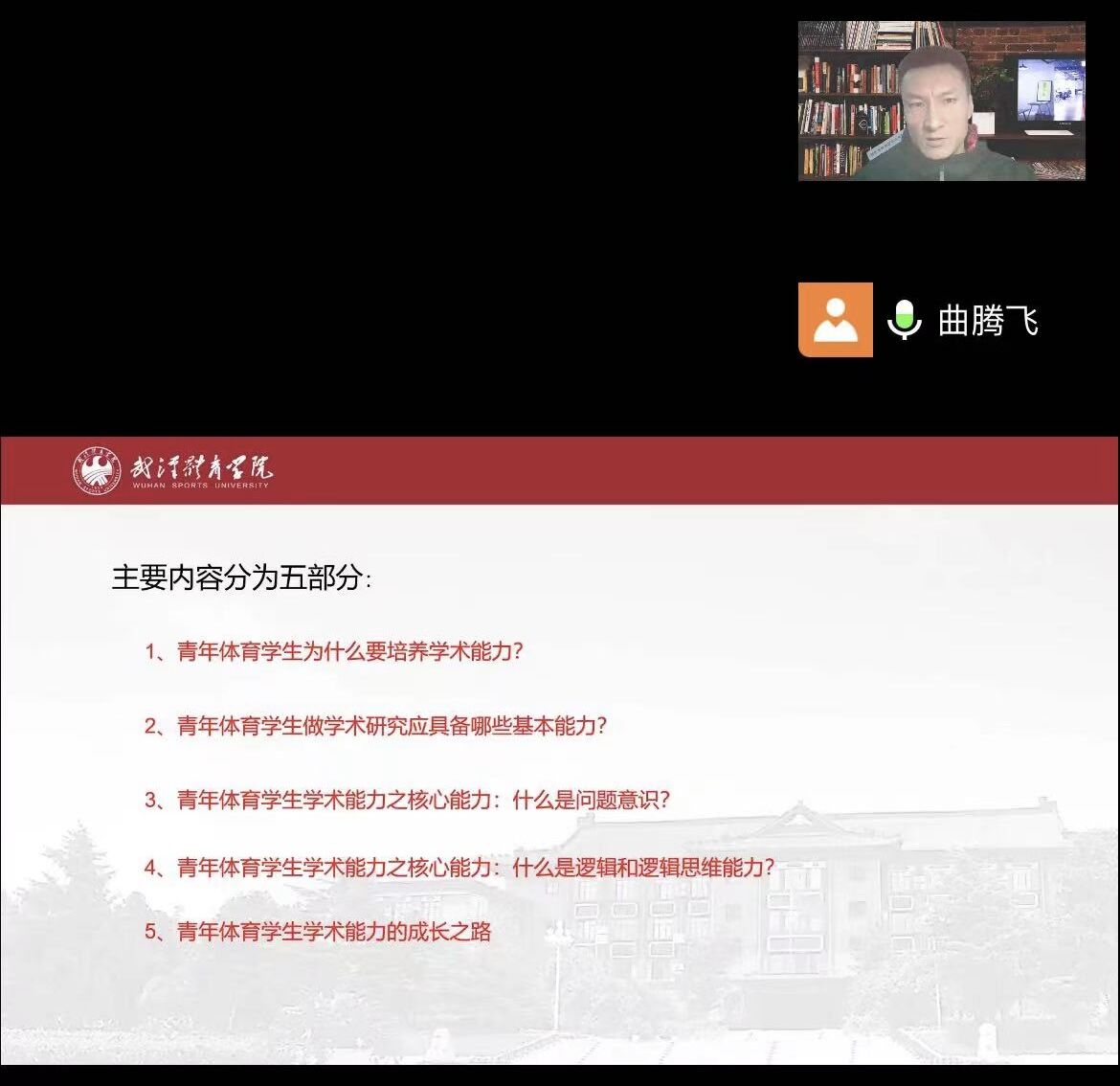 为提升研究生学术思辨能力,1118日下午七点,太阳集团城娱8722在腾讯会议举办“问题意识和逻辑思维”青年体育学生学术能力培养的学术讲座。讲座由体育曲腾飞(博士)主持,2122级全体学生聆听。