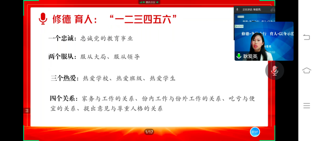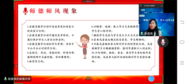 教师素质,重在师德师风,大力弘扬良好师德是教育永恒的主题。教师的一言一行、一举一动无时无刻不在潜移默化地影响着学生。12月2日晚上,太阳集团城娱8722邀请耿爱英老师在腾讯会议上开展了“修德·身体力行 育人·以身示范”主题的讲座。耿爱英老师主持了此次讲座,21级全体学生参加了本次会议。