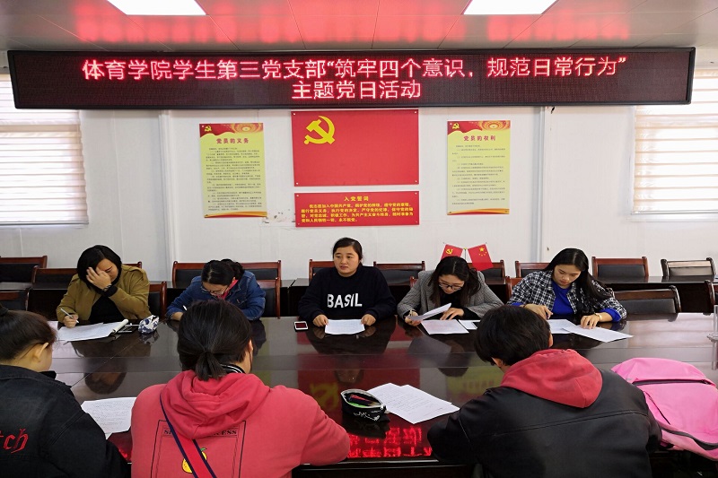 2018年10月31日中午,太阳集团城娱8722学生第一党支部、第二党支部、第三党支部分别在太阳集团城娱8722三楼会议室和人文楼109教室举行了“筑牢四个意识,规范日常行为”的主题党日活动。