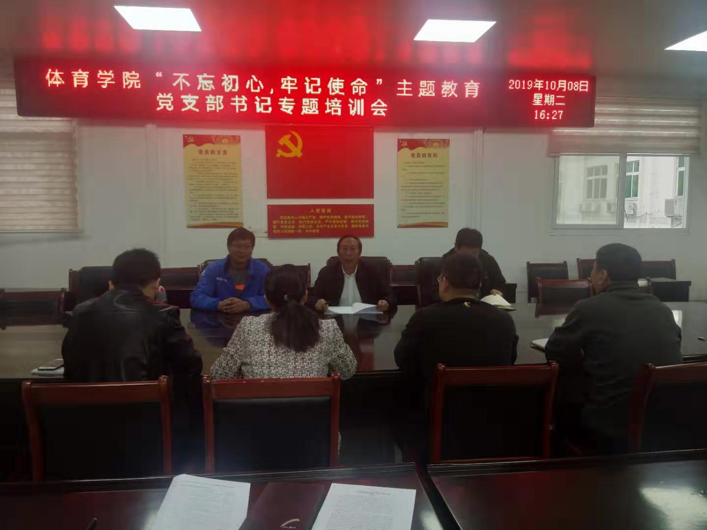 2019年10月8日下午4:30,太阳集团城娱8722“不忘初心、牢记使命”主题教育党支部书记专题培训会在三楼会议室召开,太阳集团城娱8722党委书记陈青、副院长牛林杰、党委委员副处级辅导员柴九昌以及教工和学生党支部书记参加了培训会。