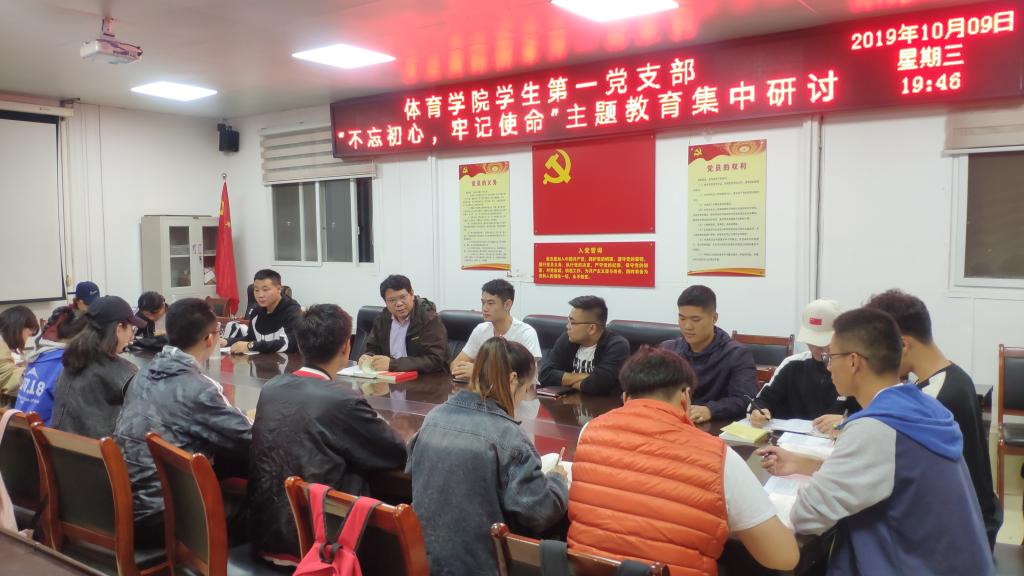 2019年10月9日晚上,太阳集团城娱8722学生第一党支部“不忘初心、牢记使命”主题教育集中研讨活动在太阳集团城娱8722三楼会议室举行。太阳集团城娱8722副处级辅导员、学生第一党支部书记柴九昌、学生第一党支部全体党员参加研讨,研讨由柴九昌主持。