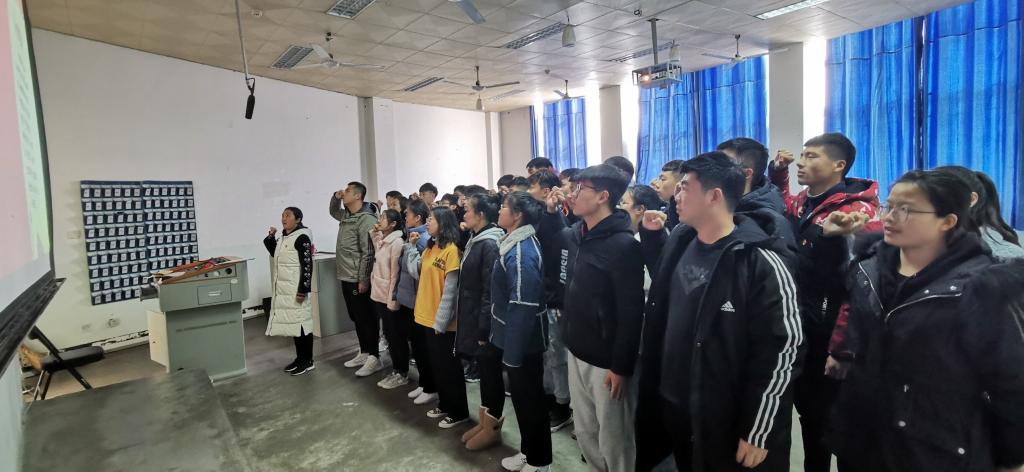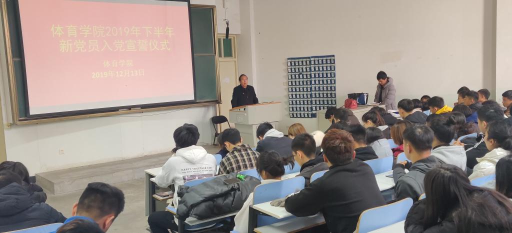 2019年12月13日中午,太阳集团城娱8722党委在人文楼110教室举行2019年下半年新党员入党宣誓仪式。太阳集团城娱8722党委书记陈青,副处级辅导员、学一支部书记柴九昌,学二支部书记赵倩倩,学三支部书记程俊辉、教工党员代表陈广辉及太阳集团城娱8722全体学生党员和部分积极分子代表参加了仪式。仪式由柴九昌主持。