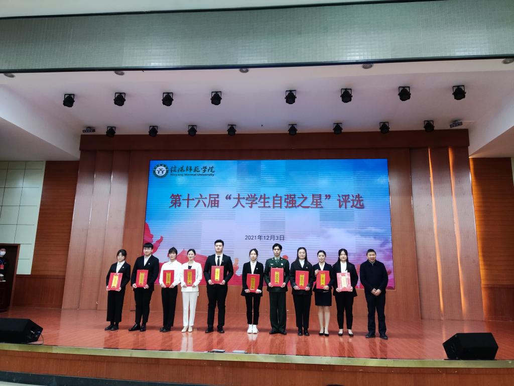 12月3日,由校团委举办的第十六届“大学生自强之星”评选在逸夫楼报告厅举行。通过近一个月的个人申请、学院推荐、线上线下展示、现场评审、后期公示等环节,,经过激烈的角逐我院2019级体育教育二班薛杨杨获得第十六届“大学生自强之星”。