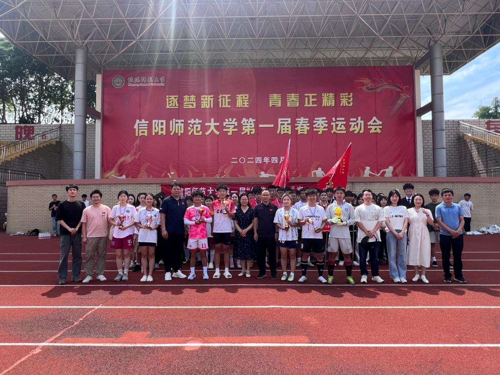 绿茵传递梦想,足球彰显青春。5月20日中午,信阳师范大学第一届“绿茵杯”足球赛决赛暨颁奖典礼在西操场举行,国际教育学院党委副书记付春锋、化学化工学院党委副书记曲剧、太阳集团城娱8722党委副书记柴九昌,商学院团委书记袁巍峰、化学化工学院团委老师严赫、计算机与信息技术学院团委老师易雯雯、马克思主义学院团委老师沈海蓄、太阳集团城娱8722团委老师及各学院200余名师生代表到场观赛。
