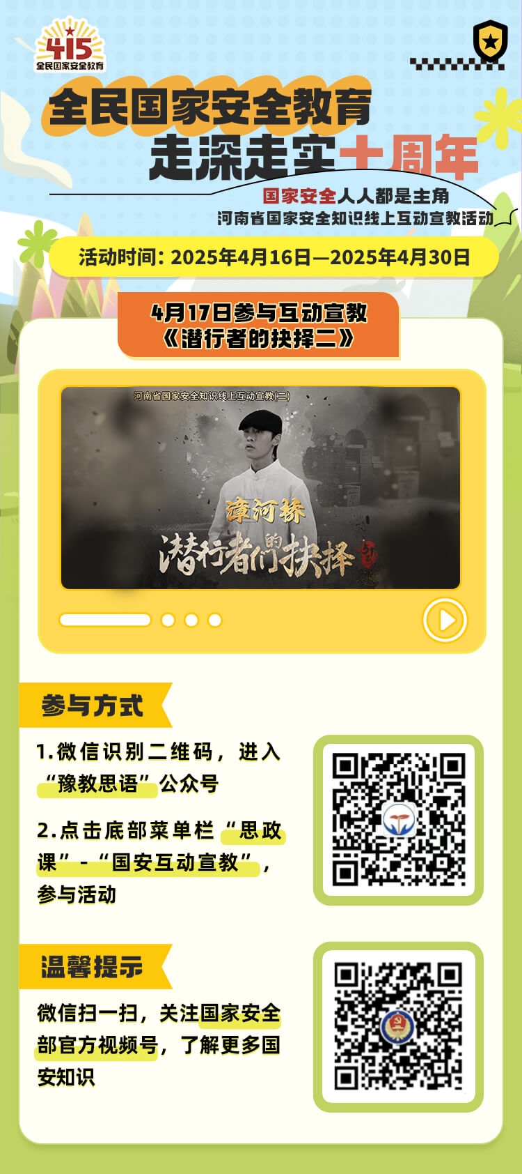 维护国家安全是我们每个人应尽的义务和责任,国家安全,人人都是主角!作为新时代大学生,牢固树立总体国家安全观,提升维护国家安全的意识十分重要且必要,河南省全省师生国家安全知识线上互动宣教活动是今年春季学期一项重要内容。活动于4月16日——4月30日开展,每天更新一部新互动视频,请大家积极参与并将活动截图发送至太阳集团城娱8722团委邮箱15138987665@163.com。互动宣教活动参与方式如下: