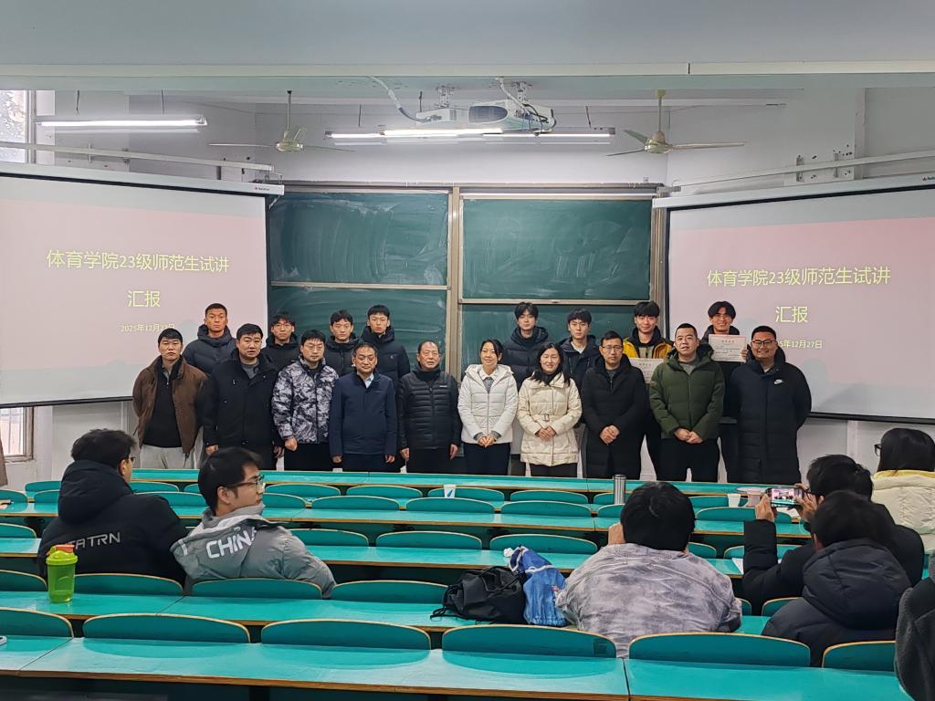 2025年12月27日,太阳集团城娱8722在星驰楼105教室举行2023级师范生试讲学院汇报展示。王德华教授、邱烈峰教授、唐永泉博士、肖丽博士和王刚博士作为评委参与本次工作,10名试讲优秀学生代表上台进行汇报,2023级体育教育专业全体学生参与了本次汇报工作。