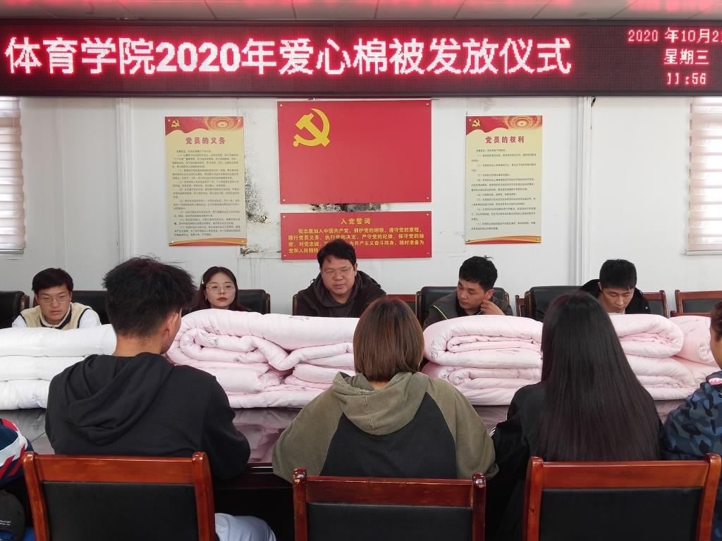 会上,柴九昌发表了讲话,表达了国家和学校对青年大学生的关心和爱护,还建议同学们珍惜大学时光努力学习,生活中加强身体锻炼,拥有健康的体魄。最后,给同学们一个衷告:无惧生活中的困难,学习是重心,希望同学们在学校快乐学习,快乐生活。仪式最后,参会的领导老师为我院学生代表发放棉被。