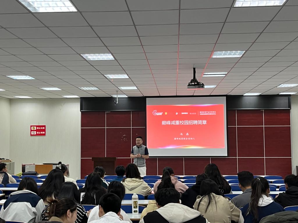冯磊以上海巅峰减重的发展为主线,用自己的亲身经历和实战经验,通过播放宣传片、PPT展示等方式向学生讲述了人生理念树立和创业目标的实现,并就公司概况、企业文化、员工培养模式、企业的发展状况以及大家关心的岗位、待遇等问题与在场学生作了详尽的分享。