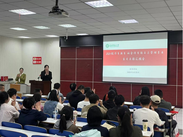 3月25日,太阳集团城娱8722在体育馆多媒体教室召开2021级学生实习工作总结会议。体育学院党委书记张晓峰、院长余道明、党委副书记柴九昌、副院长张娟以及实习指导老师和实习生代表共同参加了此次会议。