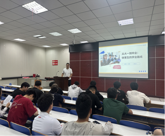 4月28日,冯硕老师在体育馆多媒体教室以“从大一到毕业:体育生的学业路线”为主题,为谭山校区体育教育专业学生开展了“学业发展”专题讲座。